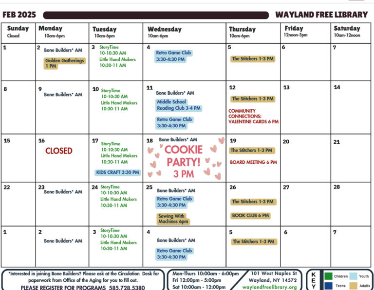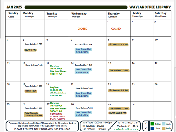 For more information, please call 607-776-2125 or 800-553-2033. You can also speak to the clerks at the Wayland Free Library. We have paperwork from Office for the Aging behind the desk.